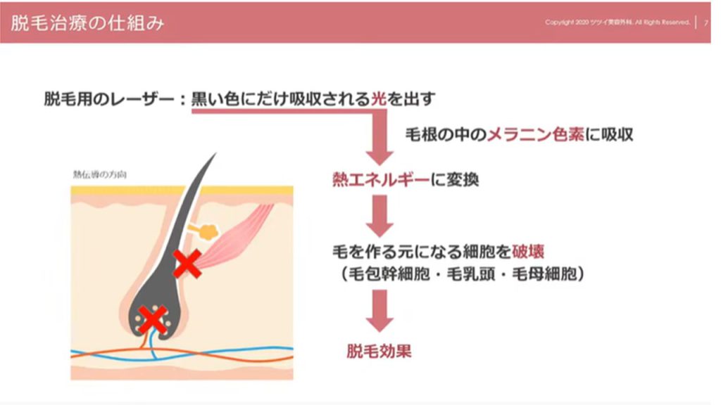 毛根の黒い部分(メラニン色素がたくさんある毛)に医療用レーザーの光が当たると高熱となり、この熱エネルギーが毛を作る元になる細胞を破壊していき、脱毛効果が得られるというのがレーザー脱毛の仕組みになります。ではなぜ毛が抜け落ちてもまた生えてくるのか。