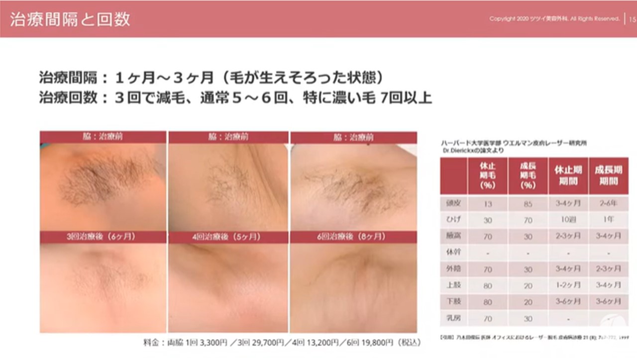この状態から毛がしっかり生えた成長期の段階で、レーザーを照射すると組織が破壊され毛が生えてこなくなりますので、毛が生え揃う1~2ヶ月間隔を目安に、照射を繰り返し行う必要があります。