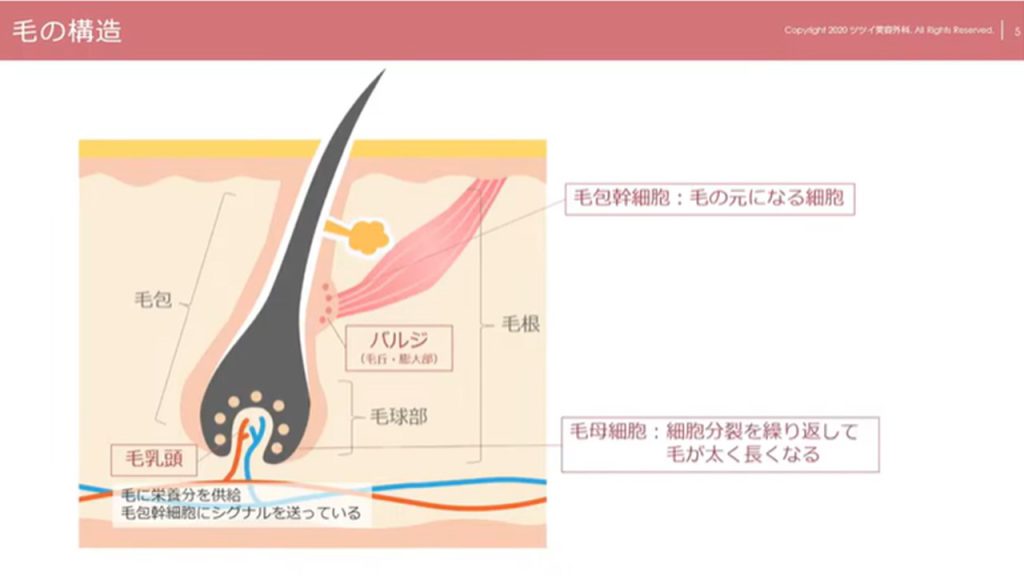毛は図のような構造になります。毛母細胞が細胞分裂を繰り返すことで毛が長く伸びていきます。