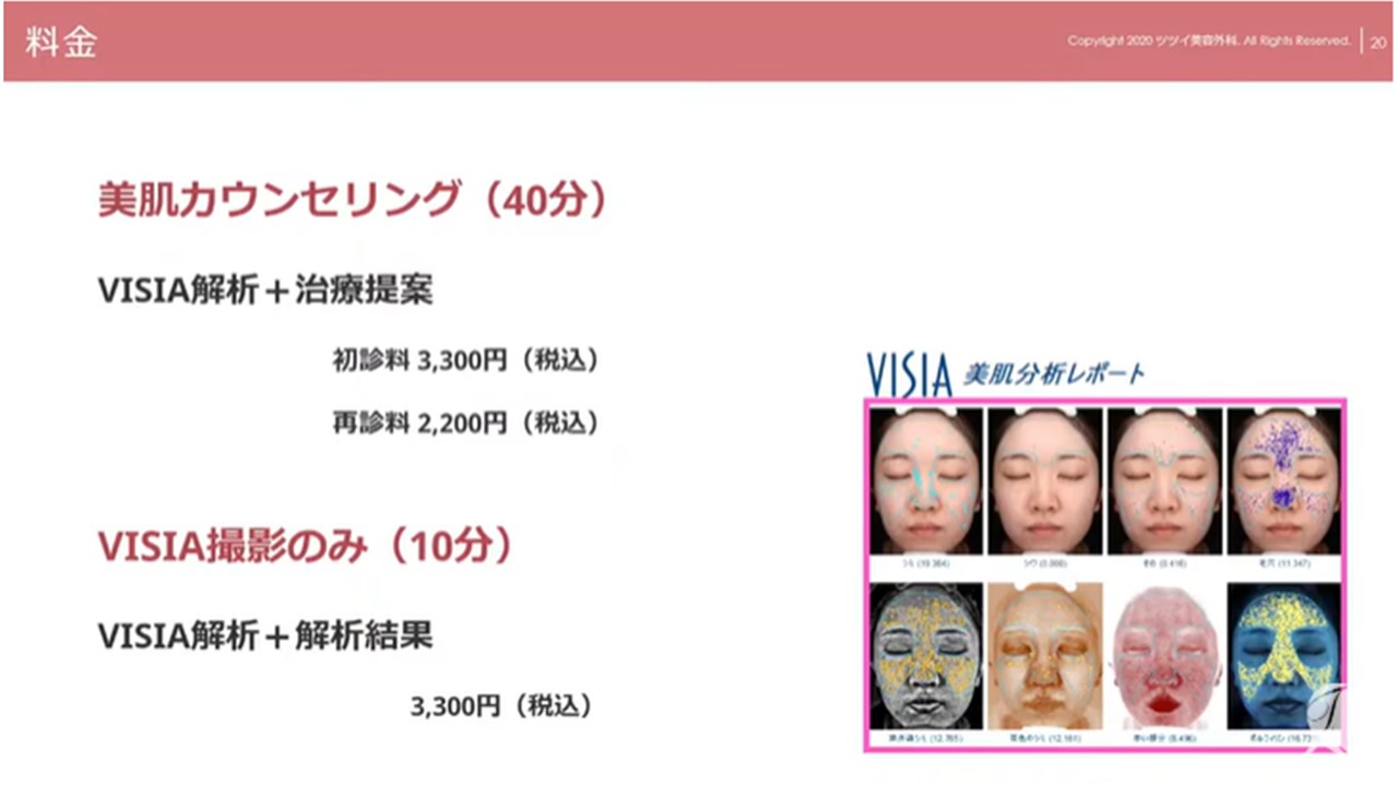 VISIAの撮影のみのメニューもございます。撮影と解析結果のお渡しをします。VISIAの解析結果をもとに治療の提案をご希望の際は美肌カウンセリングでご予約ください。