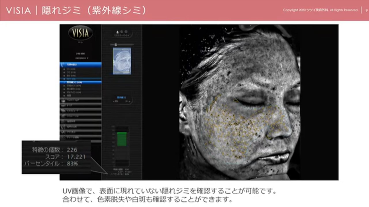 表面化されていないシミを紫外線を使って表示されます。将来出てくるであろうシミがどのくらいあるのかがわかります。
