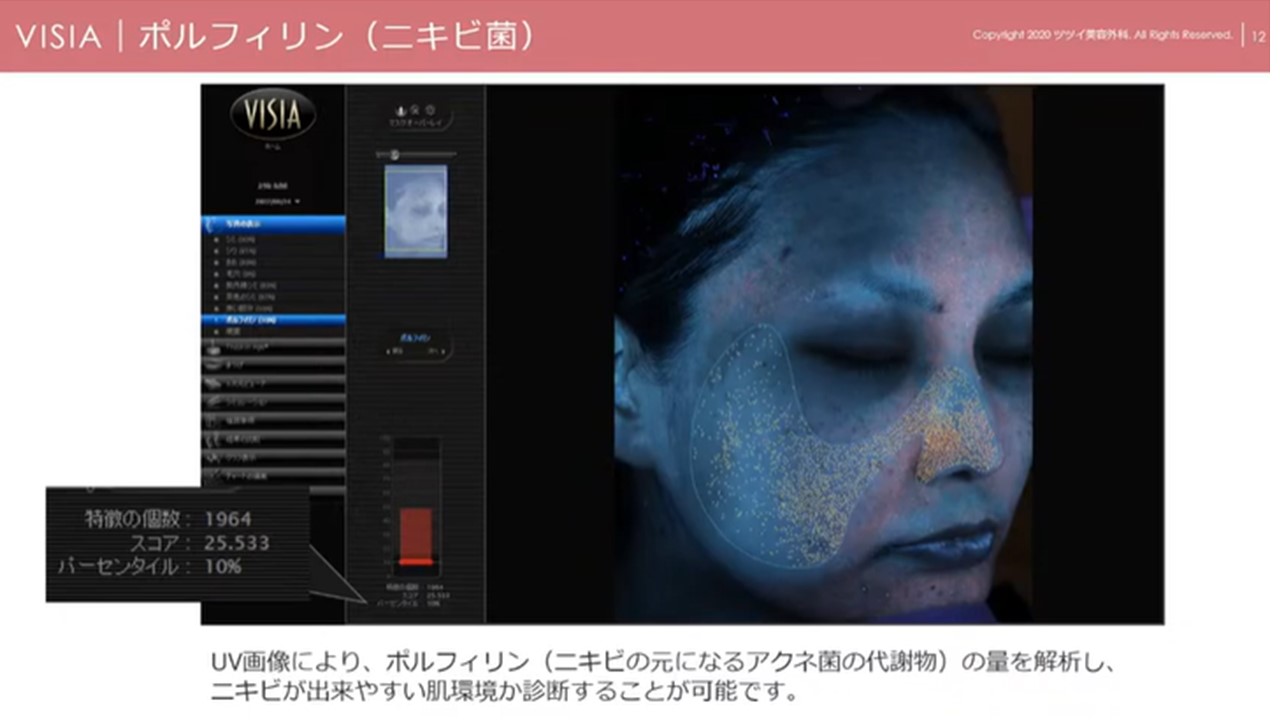 ニキビ菌は写真で撮ることができないため、ポルフィリンの数を表示しニキビができやすい肌環境か診断することができます。ニキビ菌は常在菌なのでどのような方でも存在しこれを0にすることはできません。ニキビができやすい方はこのポルフィリンの数が多いのが特徴です。