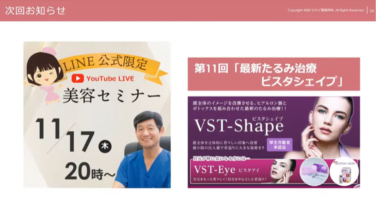 次回は最新たるみ治療「立体ヒアルロン酸治療 ビスタシェイプ」についてご紹介させていただきます。