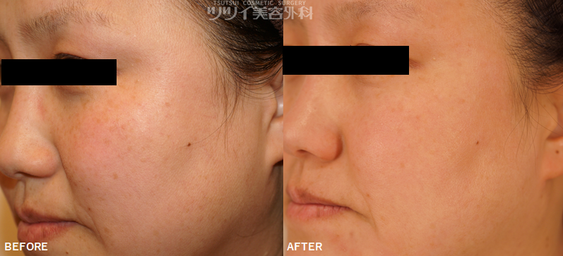 ご覧いただいたように、頬にあった散在したソバカス・小さい数多くのシミはかなり改善しました。実は改善されたのはシミだけではありません。