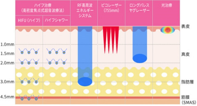 ハイフは高密度焦点式超音波療法ということだけあり、お肌の中の層に対してピンポイントに確実を熱エネルギーでアプローチして治療を行います。この技術はその他のレーザーや高周波では行うことができません。