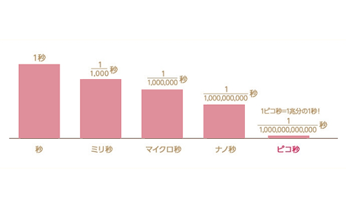 従来のQスイッチレーザーは、ナノ秒という単位でレーザー照射していましたが、ピコレーザーは、ナノ秒の1000分の1のピコ秒でレーザー照射します。
