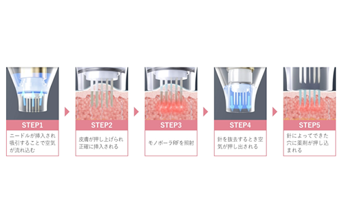 ドラッグデリバリーシステムとは薬剤伝達システムのことで、針を入れる際に吸引することで空気が流れ込み、肌を押し上げ、針を抜く際に押し出される空気により薬剤が導入されるPOTENZA(ポテンツァ)独自機構です。