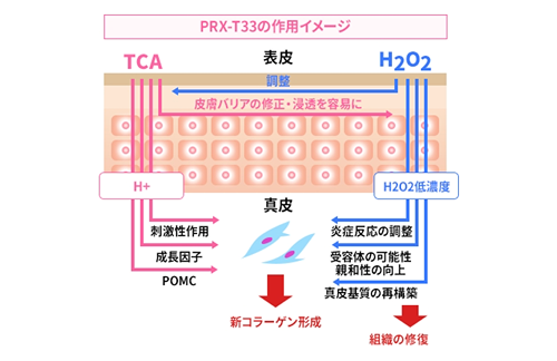H₂O₂は表皮細胞との親和性が高く、速やかに表皮表層へ到達。一方TCAは、ゆっくりと表皮から真皮へ穏やかに浸透していきます。