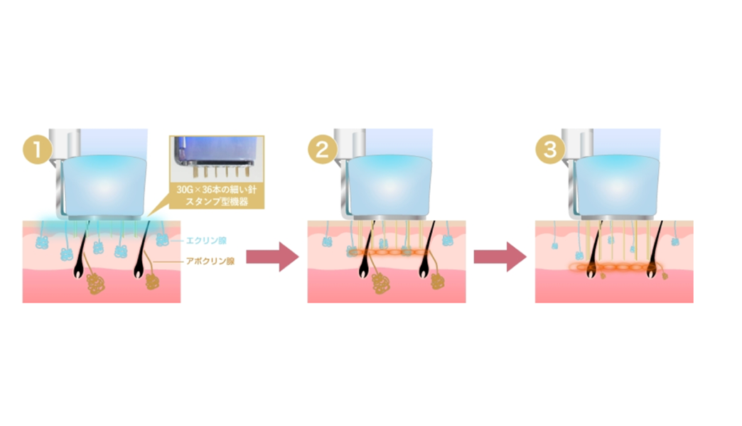 酸度を調整した麻酔液を使用することで痛みを最小限に抑え、30Gの極細針と冷却機能を備えたスタンプ型の機器で、汗腺の深さに合わせて高周波を照射します。周囲の組織に影響を与えにくく、火傷のリスクも抑えられる安全性の高い治療です。