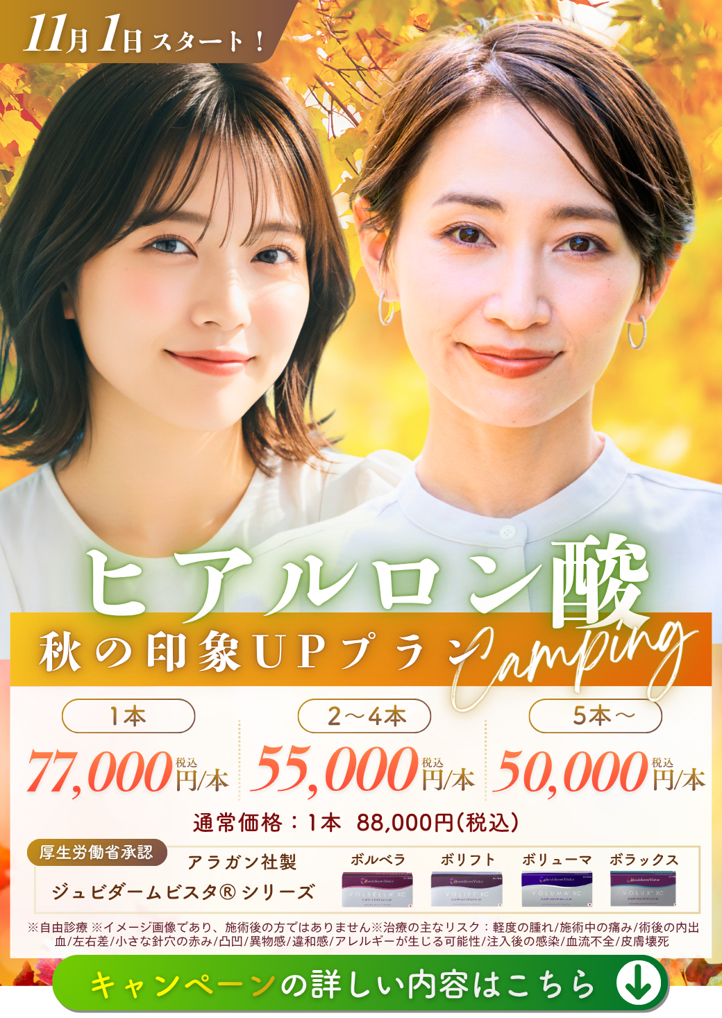 ツツイ美容外科のHPをご覧いただき、ありがとうございます。日々頑張る皆さまへ、秋限定の「ヒアルロン酸注入企画」のお知らせです。 ― 頑張る“あなた”へ、自分に贈る「美容というご褒美」― 日々、家事・育…