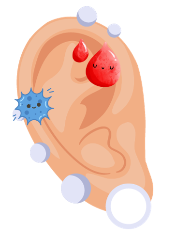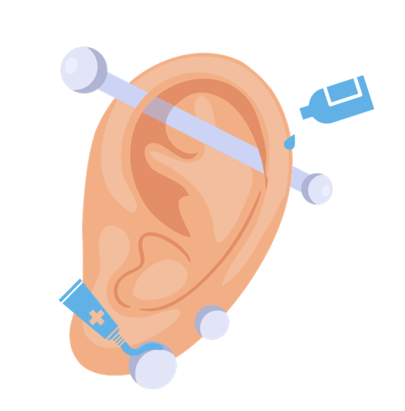 ピアッシング前後に必ず消毒し、穴あけ後は軟膏を塗布することで、細菌感染を防ぎます。