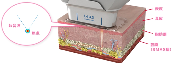 正式には「高密度焦点式超音波」と呼ばれる技術を使い、超音波エネルギーを肌の奥深くまで届けることで、たるみや肌のハリを改善します。