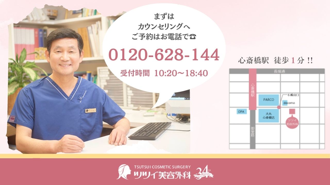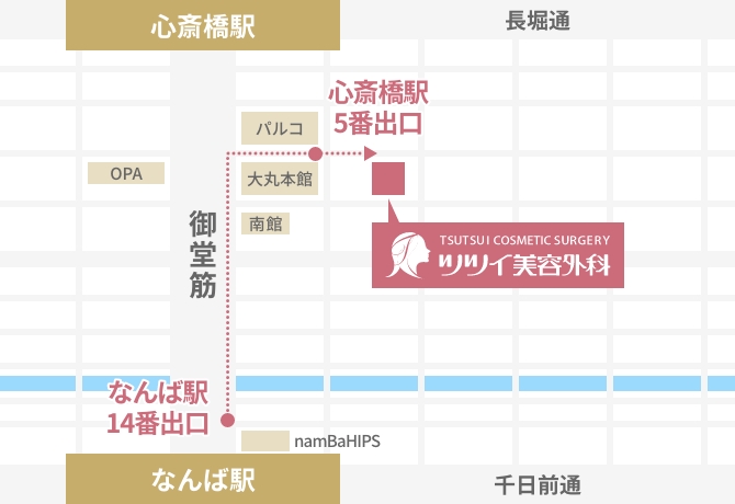 ツツイ美容外科は、大阪メトロ「心斎橋駅」から徒歩1分の便利な場所にあります。