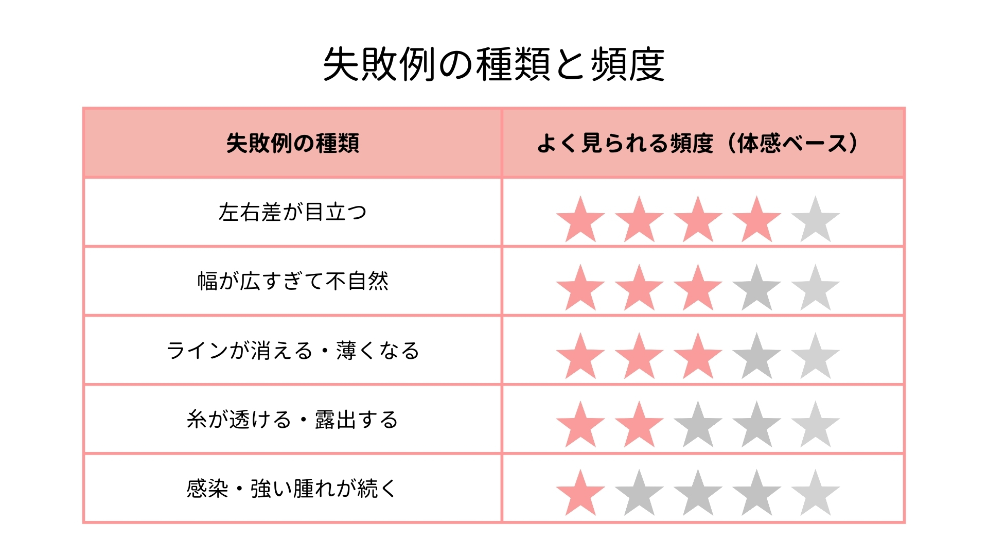 ただし、「腫れが残っている」「ダウンタイム中でラインが安定していない」だけの場合も多く、施術直後は失敗かどうか判断が難しい点もポイントです。