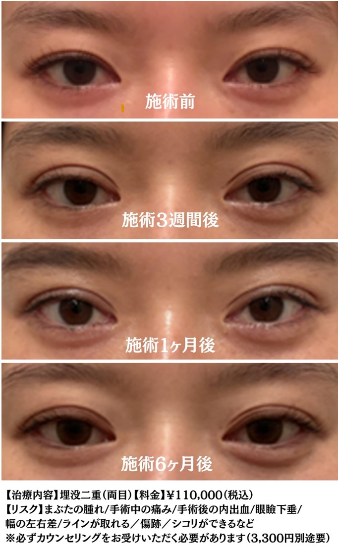 このようにダウンタイム中に、俗に言う”ハム目”になっていないか、という心配される方がいますが、カウンセリングにて目の状態を診察し、その方に合った適切な術式(切開・埋没)で、適切な二重幅を決定すると、不自然な状態になることはほとんどありません。数か月かけて完全に腫れが引くと理想の仕上がりになります。