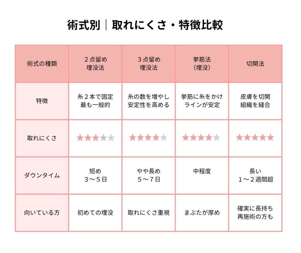 多くのクリニックには「取れた場合の再施術保証」があります。保証期間内であれば無料または低価格で再埋没が可能なことも多いため、まずは受診するのが賢明です。