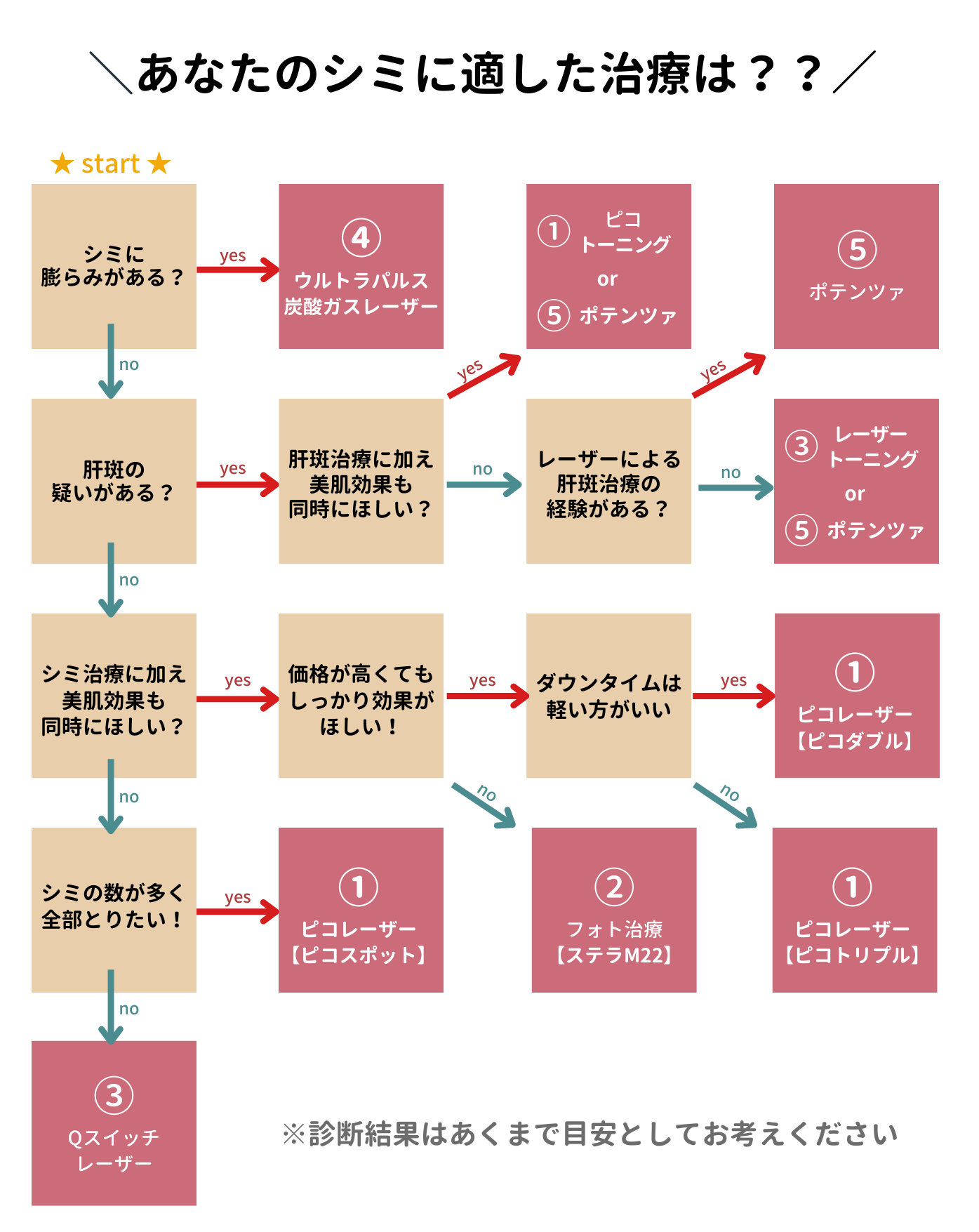 あなたのシミはどのシミに該当しましたか?シミの状態によって、治療方法が異なってまいります。ツツイ美容外科でご案内しているシミ・そばかすメニューをご紹介いたします。