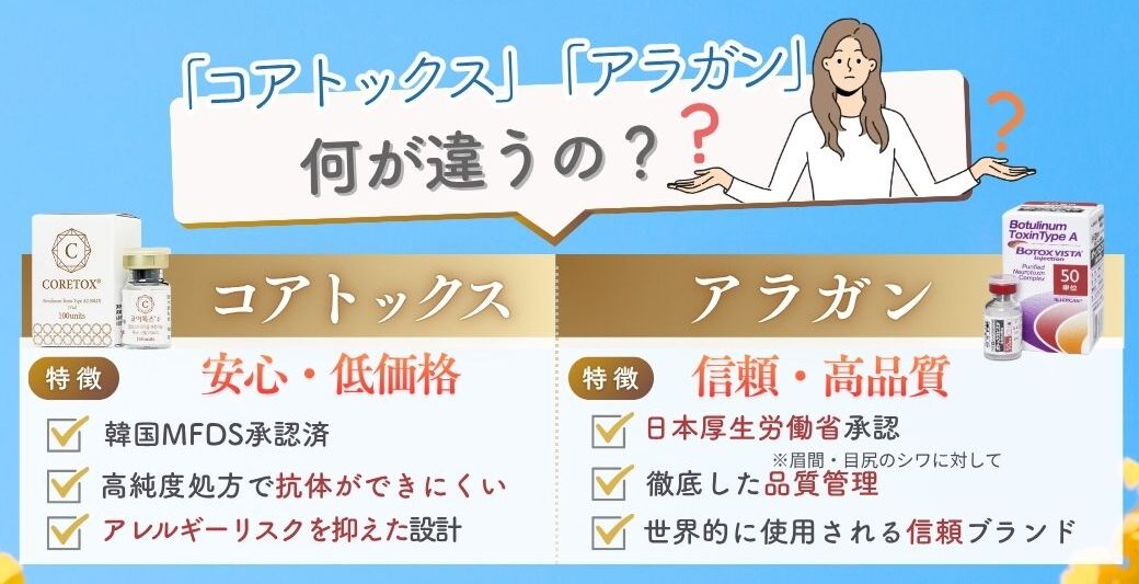 一方、ボトックスビスタ(アラガン社製)は厚生労働省承認の製剤で、長年にわたり世界的に使用されています。
